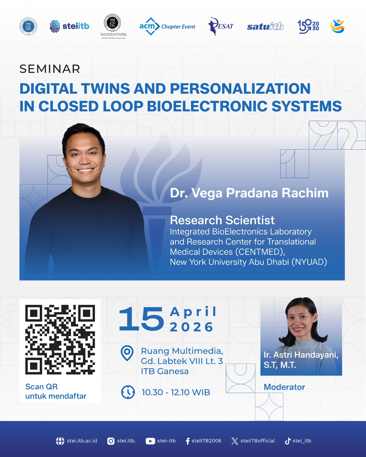 The School of Electrical Engineering and Informatics ITB will host an international seminar titled “Digital Twins and Personalization in Closed-Loop Bioelectronic Systems” on April 15, 2026. The event will take place at the Multimedia Room, Labtek VIII Building, 3rd Floor, ITB Ganesha Campus, from 10:30 to 12:10 WIB.